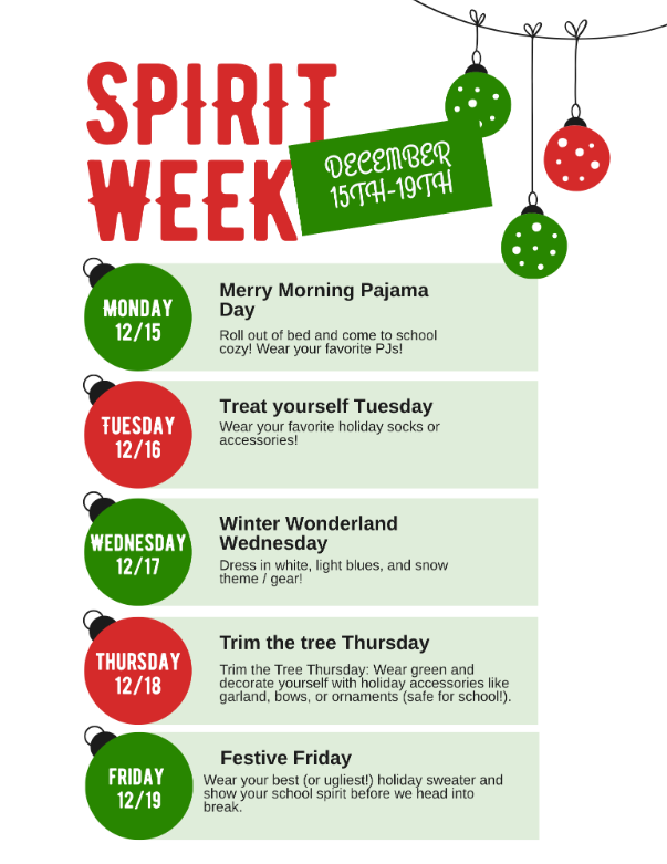 Friday 12/19– Festive Friday: Wear your best (or ugliest!) holiday sweater and show your school spirit before we head into break.