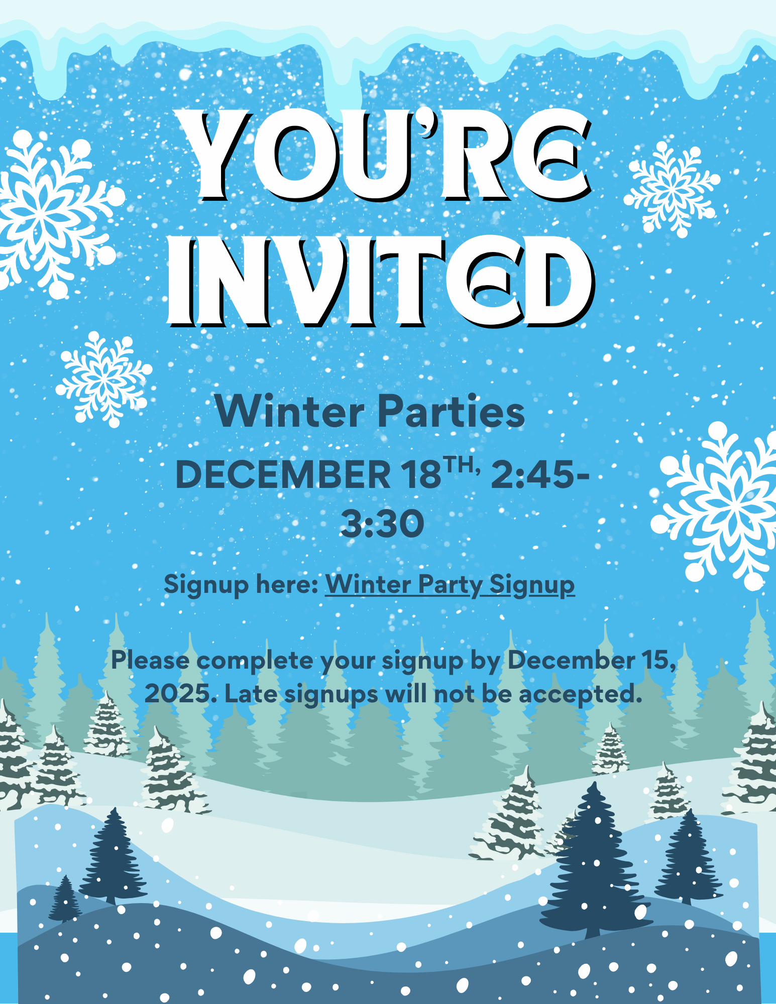 You’re invited to our Winter Parties on December 18th from 2:45–3:30 PM!